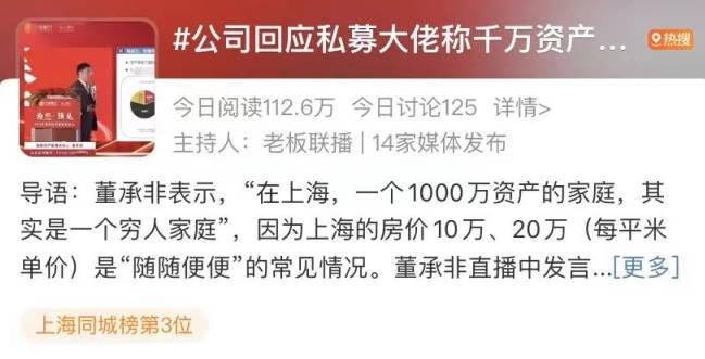 近日一名私募大佬的一句發言竟然引發了熱議,知名私募基金經理,睿郡資產管理合伙人、首席研究官董承非在一場交流路演中說道:“在上海一個1000萬資產的家庭其實是一個窮人家庭,因為在上海房價10萬、20萬是很常見的情況。”對此睿郡資產方面做出回應稱,自媒體斷章取義,放大解讀,對此網友們更是討論激烈。