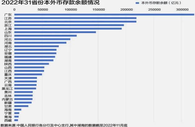 截至2022年11月底,廣東省本外幣存款余額達到32.24萬億元,是全國唯一一個突破30萬億元的省份,第二名是江蘇省,存款數據達到21.87萬億元,北京市緊隨其后差距并不大。北京、上海擁有著很多金融機構,在資金總量上有著明顯優勢,雖然存款余額排名高,但GDP相對而言會有些差距。總經濟的發達也決定了本外幣的存款余額,經濟越發達資金量就越雄厚,從存款余額排行中能看出,很多地區的存款增速較快,也反映出當地的經濟發展水平。