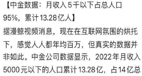 中金數據顯示,月收入5000以下占總人口的95%,累計為13.28億人,月收入在5000元以上即超過全國95%的人。在互聯網信息繭房營造的普遍焦慮情況下,這種接地氣的數據顯得十分清新脫俗,而這一則消息經過視頻、文字和圖片等渠道廣泛傳播以后,便開始引起人們的熱烈關注。“最權威收入分級來了,你屬于哪個層次?”“中金公司公布最新人均月收入,月入5000元以上就是富人。”有人對這種說法表示認可,認為這才是脫去互聯網濾鏡的真實收入水平,但是有人認為并非如此。