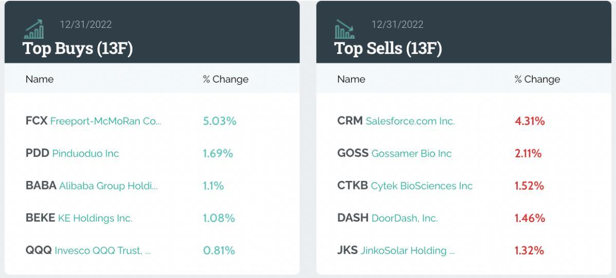 高瓴買入的股票排在前五的分別是自由港麥克蘭莫蘭,拼多多,阿里巴巴,貝殼找房,在粗略計算之下,2022年第四季度末在高齡基金排在前,50的中概股總合計的市值達到了32.47億美元,占據高齡基金在持倉量的68.5%。