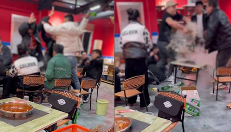 記者第一時間了解到的信息是該火鍋飯店位于西安雁塔區,飯店名叫麻一生西航涮涮,西航涮涮,通過視頻的播放,在視頻有一位身穿白色外套的男子與一名拿起酒瓶的女子發生爭執,女子拿起酒瓶開始砸向白色外套的男子,隨后白色外套的男子順手抄起酒瓶開始回擊。又在另一個視頻當中出現黑色外套的男子用力將手中的酒瓶砸向對面的女子,隨后穿著短袖的男子用酒瓶砸向對方黑色外套男子頭部,之后身穿短袖外套的男子直接將滾熱的火湯鍋全部端起頗像穿黑色外套的男子,周圍全部都是火鍋店的員工以及顧客,看到打架的場景,周邊的人都產生恐懼四處逃跑。有正義感的人試圖上前勸架,但場面混亂桌子和椅子全部凌亂,地面上到處都是酒瓶。